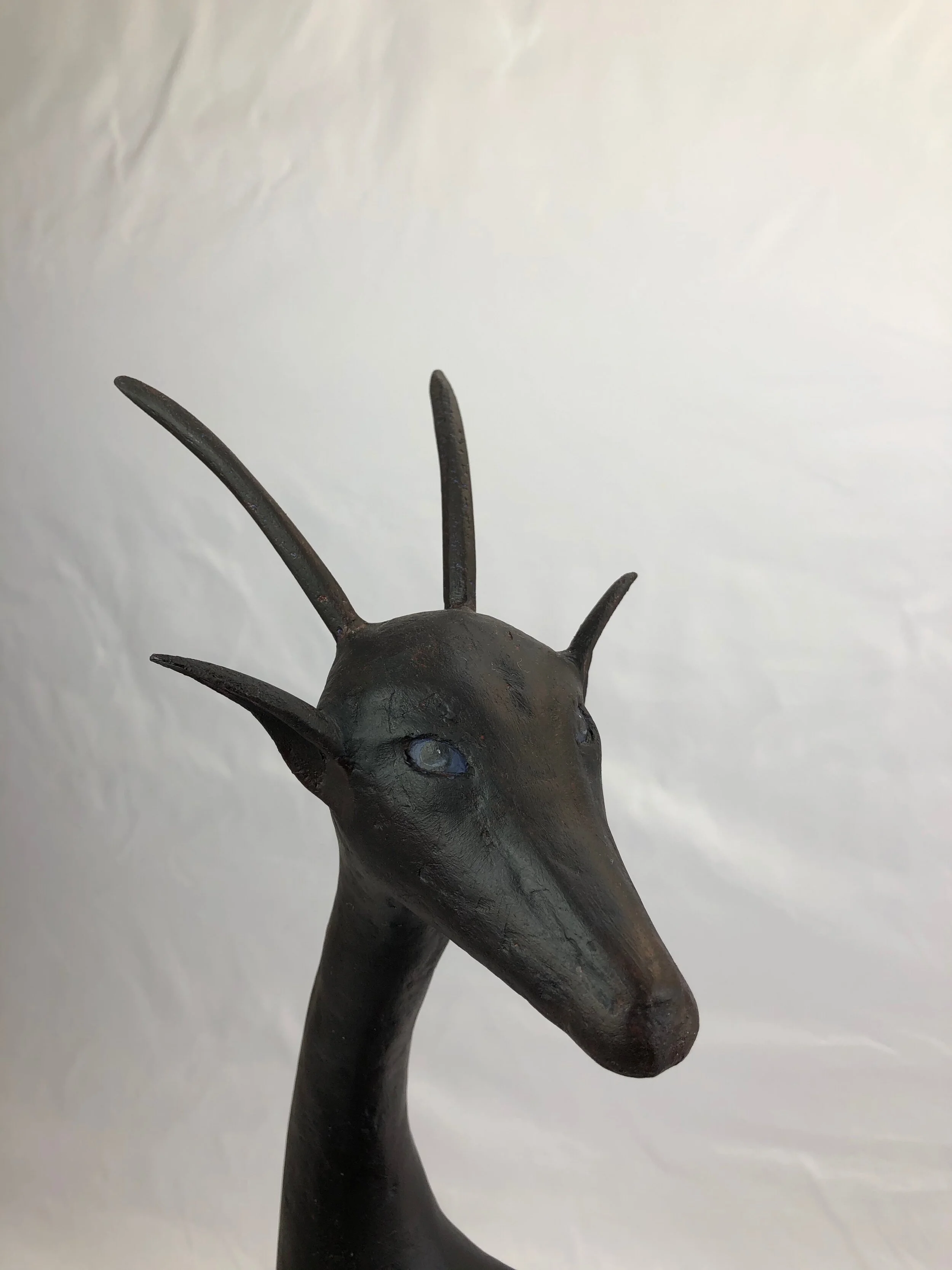 Next, the armature is covered with blocks of styrofoam and sculpted into shape with a rasp. Sometimes, I leave the antlers and hooves wooden to hint at what’s underneath.